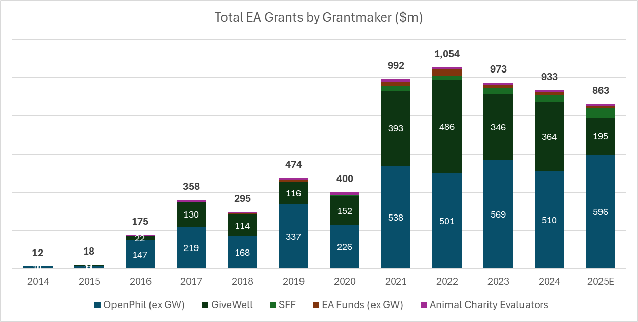 * For 2025 data, I made a judgement call on how much data was "complete" and pro-rated accordingly - e.g. from GiveWell, it looks complete up until the end of June, so I excluded an