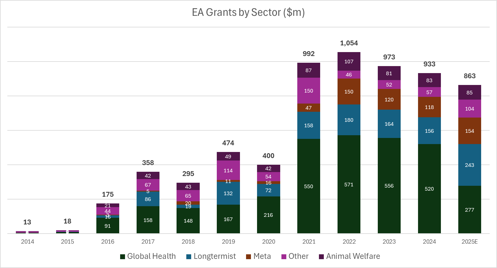 - •Provides a useful empirical baseline for understanding how EA institutional funding has evolved over time.