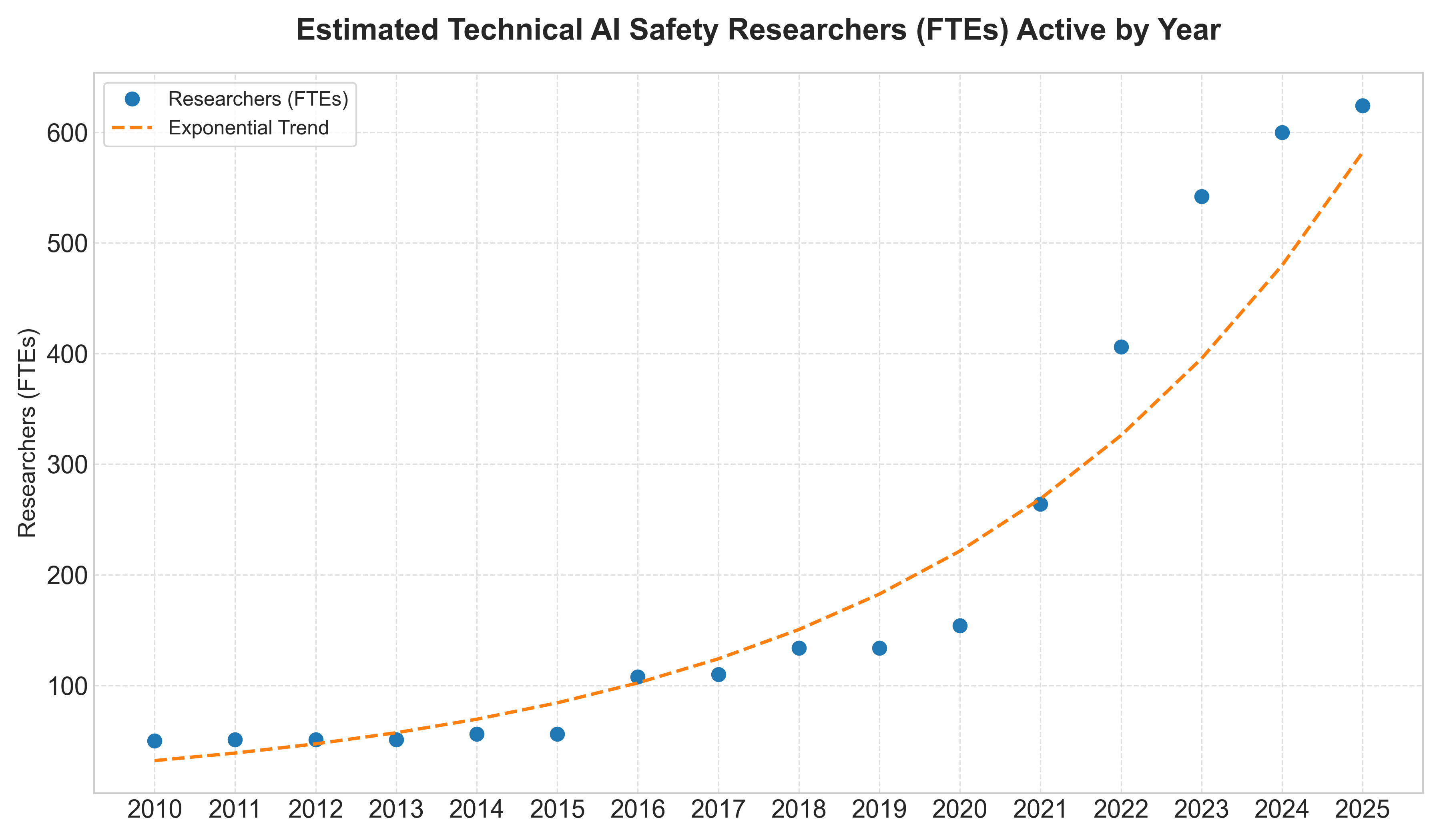 Figure 2: Scatter plot showing the estimated number of technical AI safety FTEs by year from 2010 to 2025 with an exponential curve to fit the data.