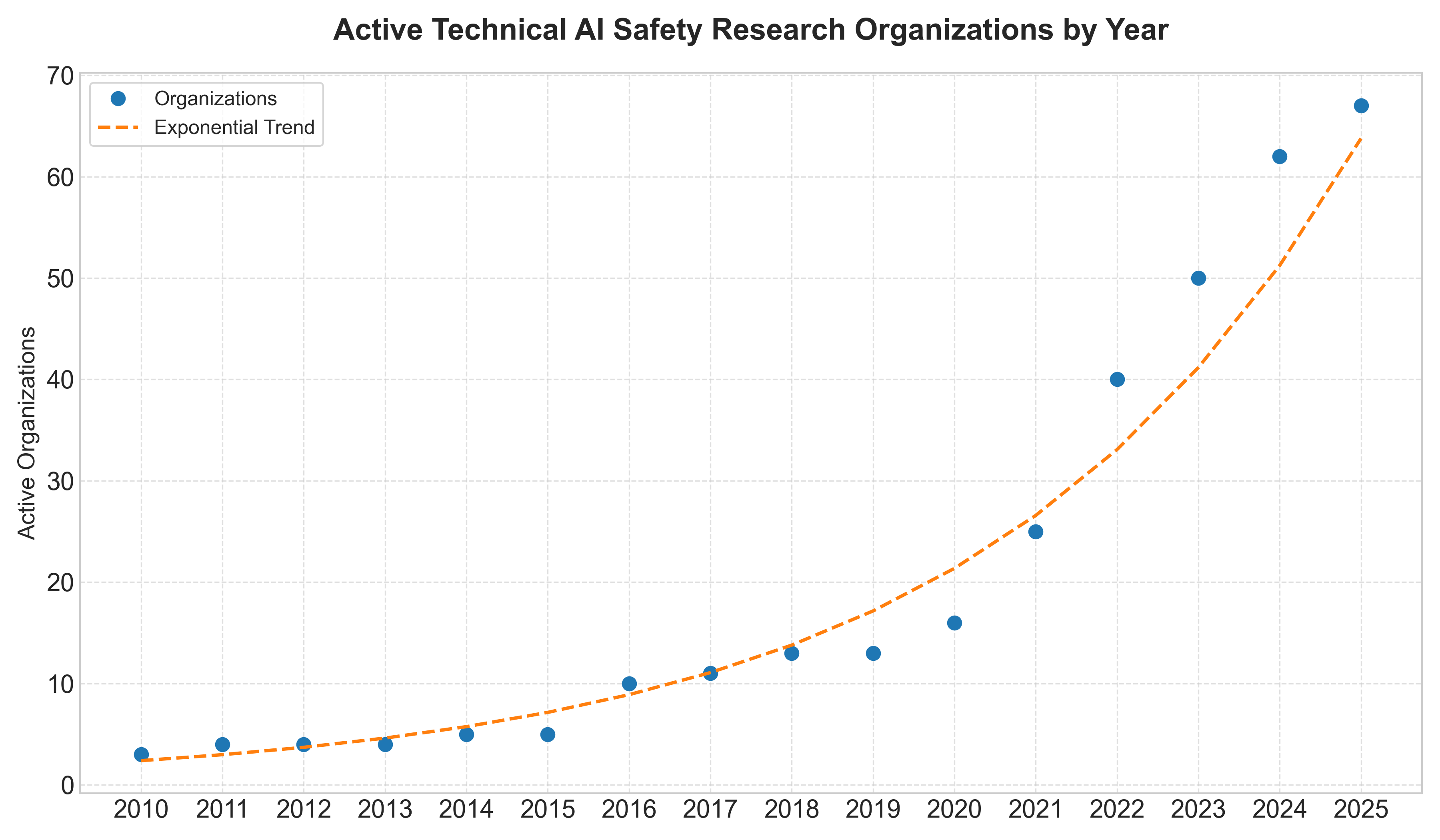 Figure 1: Scatter plot showing estimates for the number of technical AI safety research organizations by year from 2010 to 2025 with an exponential curve to fit the data.