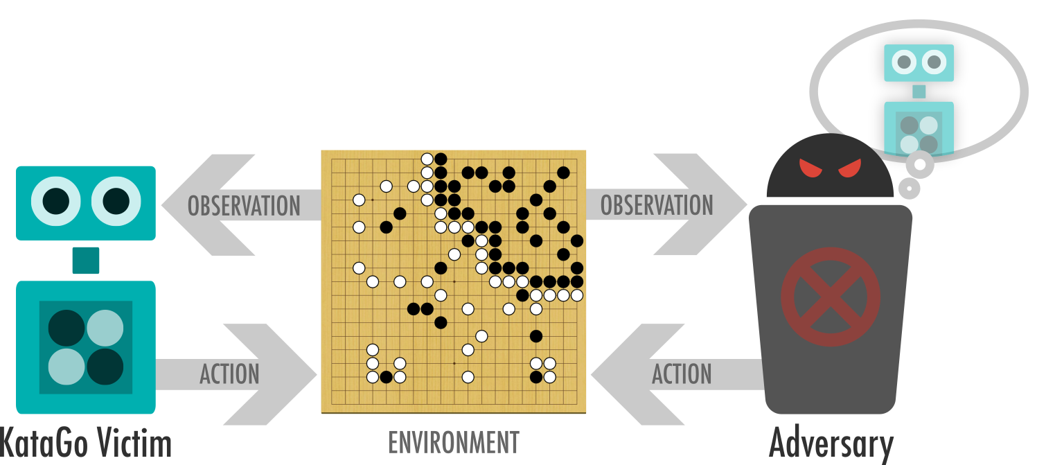 *The victim and adversary take turns playing a game of Go. The adversary is able to sample moves the victim is likely to take, but otherwise has no special powers, and can only play legal Go moves.*